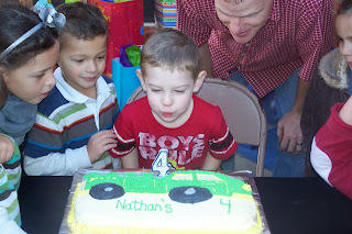 Nathan was so excited about his birthday cake. Last year he wanted a blue fire truck cake, and for almost a year now he has been asking for a green fire truck cake. This was my first cake to decorate with the tips and everything. It was fun, but it definitely took more time than I thought. You cannot really see the ladder in the picture. When I finished the cake and had Nathan look at it. He pointed out right away that it was missing a siren. That's my boy he knows his fire trucks. I didn't have time to put on the red siren, so it is missing. I also made 24 strawberry cupcakes and decorated them. Let's just say that Matt and I were very busy that morning.